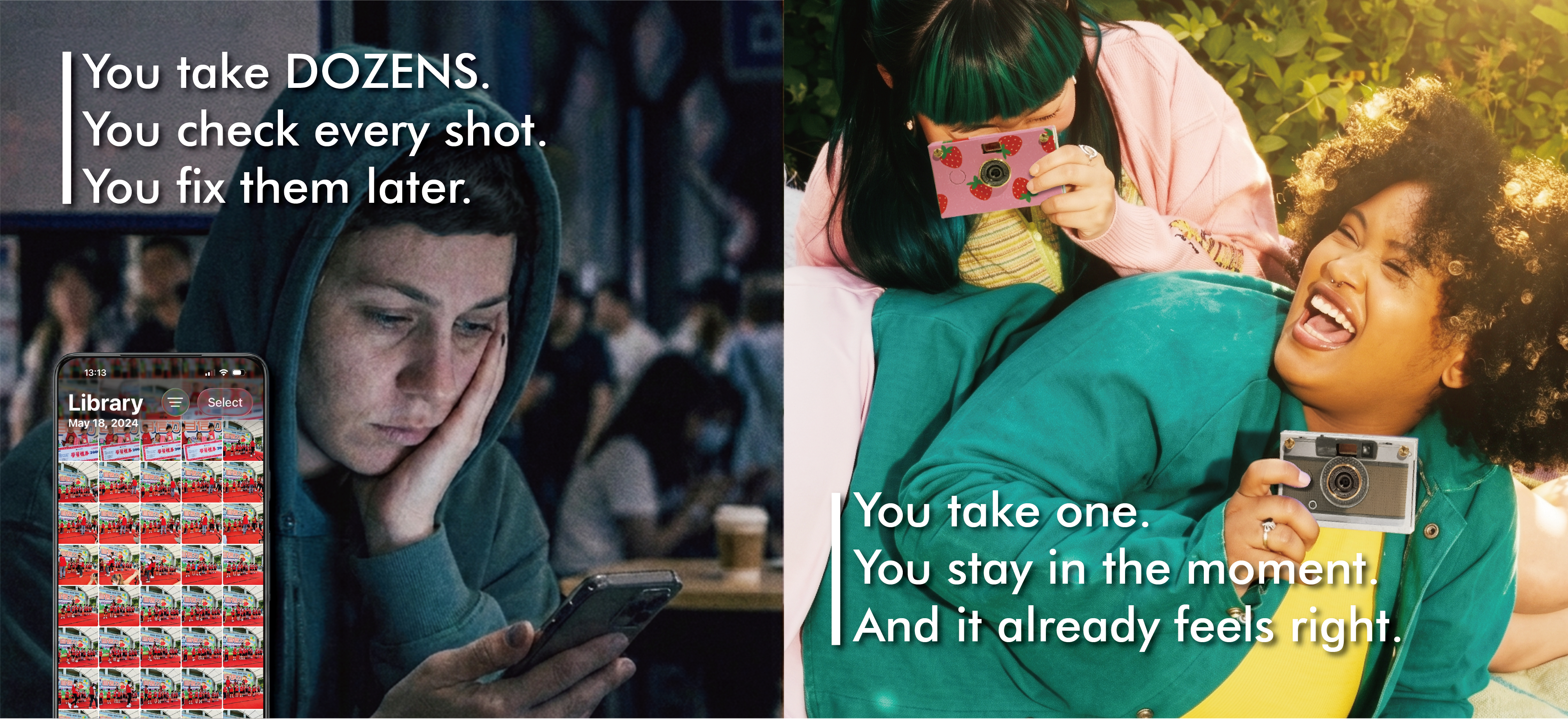 Paper Shoot is designed to remove constant checking, retakes, and distractions. You press the shutter, stay in the moment, and discover the photos later.